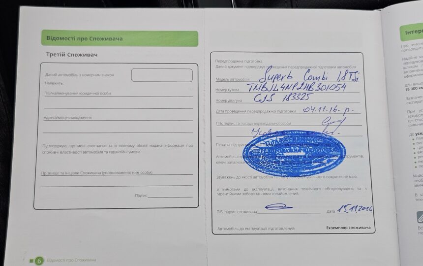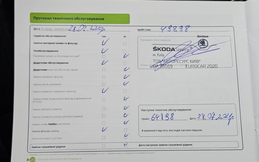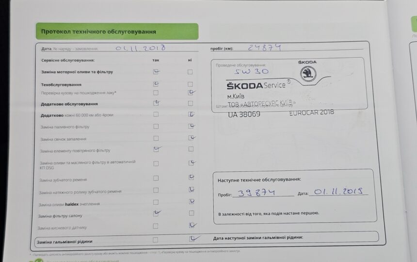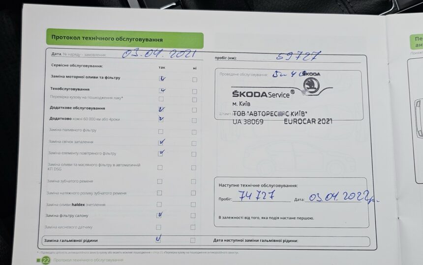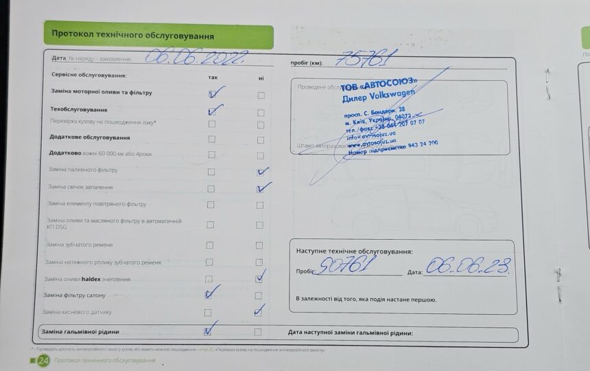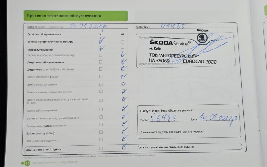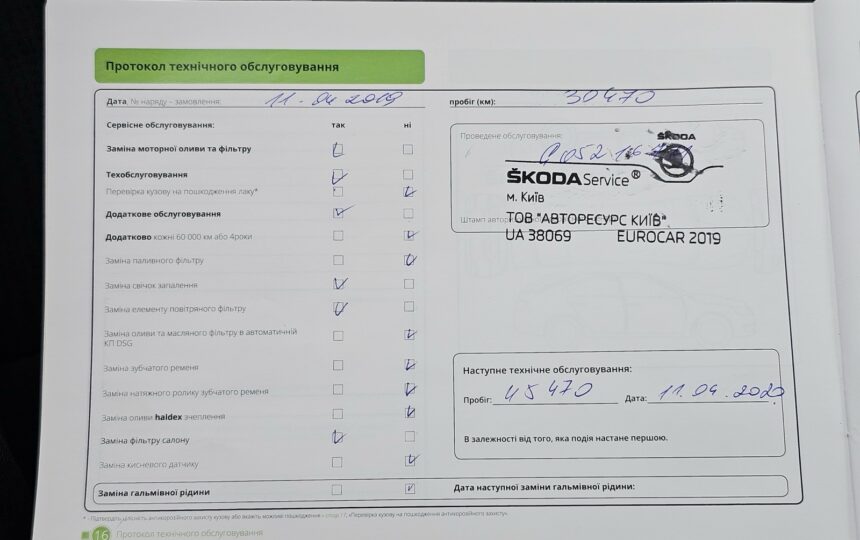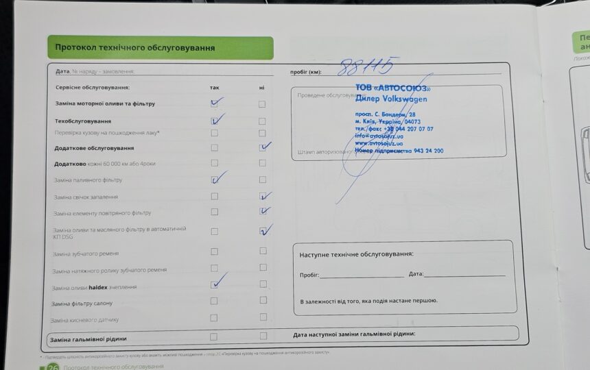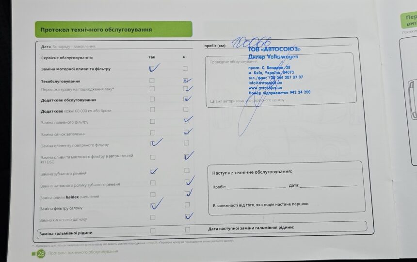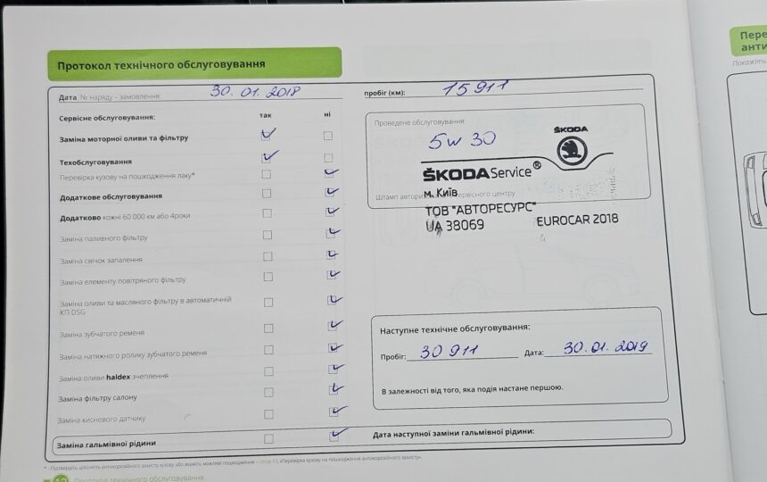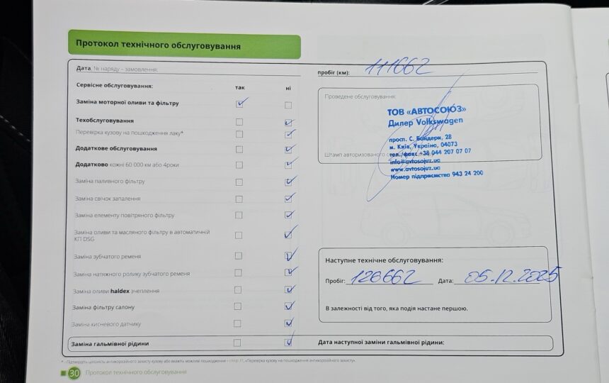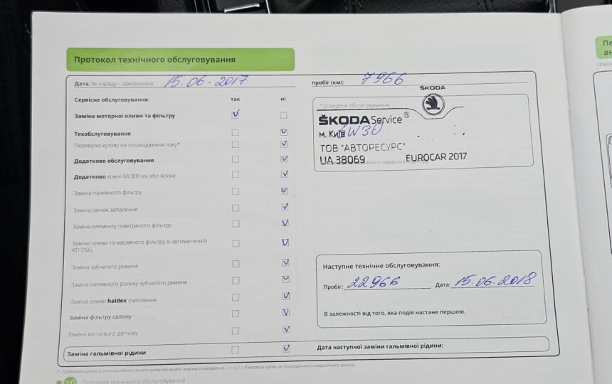 Усі ТО проходили у офіційного дилера (спочатку на Skoda, потім на Volkswagen), є сервісна книга з усіма відмітками + історія в базі дилерів